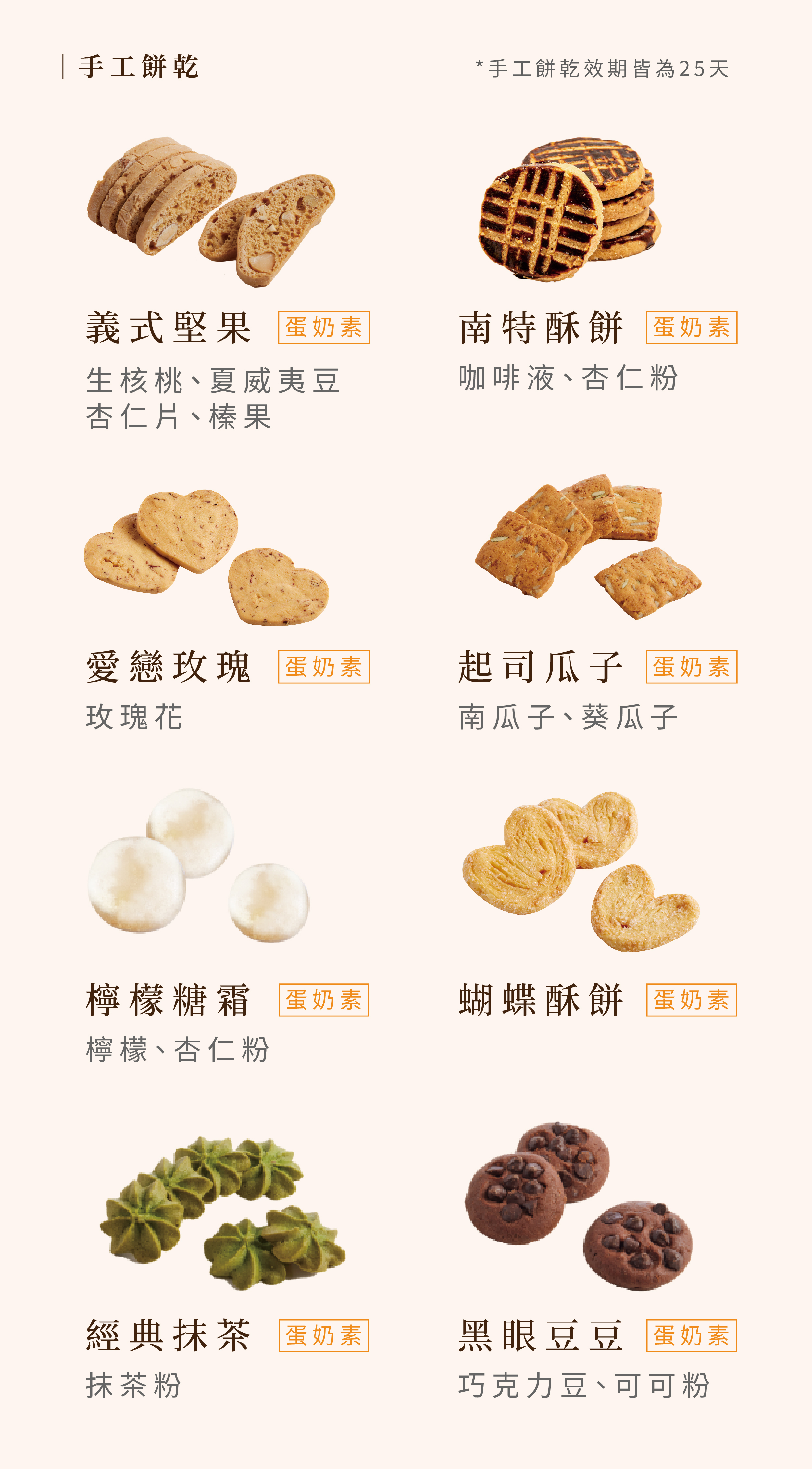 義式堅果、南特風味餅、檸檬糖霜、蝴蝶酥餅、愛戀玫瑰、起司瓜子、經典抹茶、黑眼豆豆